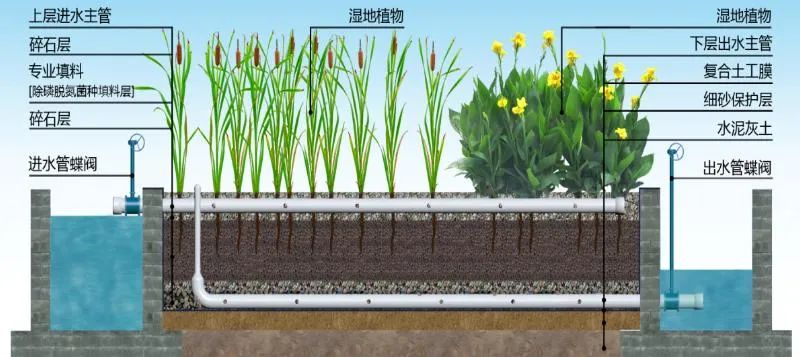 潜流人工湿地的进水方式是由上而下进水,污水均匀进入填料床底部,在湿地内部进行反应,反应过后的出水经过出水管排出。所以潜流湿地系统可以充分利用到植物根系以及富集在基质表面的生物膜。
