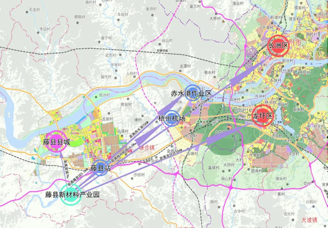 梧州绿色化工新材料产业园选址位于贵梧高速公路南侧、中和村的东侧以及北流河与西江交汇处的上游,毗邻西江机场、梧州港码头、高铁和开放口岸。形成具备良了“水、陆、铁、空”立体式综合交通格局,具备良好的地理环境。项目以钛白粉新材料、林浆纸一体化产业为主导,延伸发展绿色环保涂料、美白日化、精细化工装备、轻工制造等上下游关联产业,将园区建设成为产业特色突出、产业链科学高效、配套齐全的综合性绿色循环经济园区,打造广西“东融”创新高质量发展示范区,致力于创新梧州市产业增长点,着力打造成为产业和谐、共生发展的绿色生态园区,广西区域工业高质量发展的形象展示区和“亚洲钛白之都”。