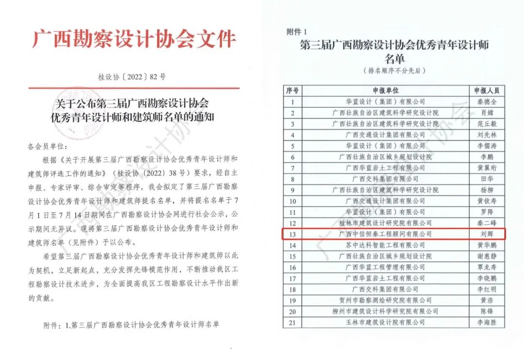 近年来,70net永乐高集团高度重视人才队伍对公司发展的战略支撑作用,不断加强青年人才引进、培育,着力发挥平台优势,培养了一批优秀青年成为业界翘楚。7月19日,广西勘察设计协会公布了第三届优秀青年设计师名单,70net永乐高综合设计研究院刘辉榜上有名,荣获“广西勘察设计协会优秀青年设计师”称号。
