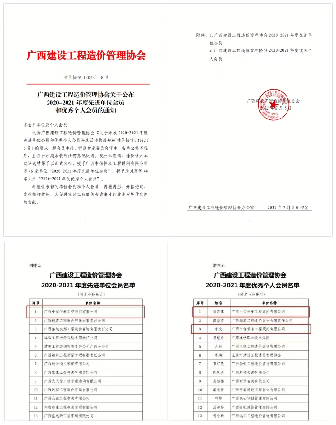 7月5日,广西建设工程造价管理协会发布“关于公布2020-2021年度先进单位会员和优秀个人会员的通知”,经组织评选委员会认真、严格评审,70net永乐高脱颖而出,荣获“2020-2021年度先进单位会员”,公司詹芃芃、曹文两人荣获协会“2020-2021年度优秀个人会员”。