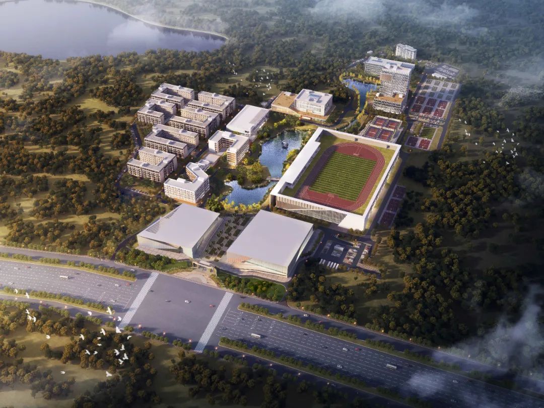 项目总投资136244.66万元,项目总建筑面积为202004.73m²。其中地上建筑面积为188288.51m²,地下建筑面积为13776.22m²。校园建设包含有综合训练馆、游泳馆、篮球馆、图书馆、行政办公与科技实训楼、学生活动与体质检测中心、学术交流中心、教师公寓、学生宿舍、食堂以及智能化系统、给排水、供配电、大门、围墙、停车场、道路、绿化及景观、水体、广场等配套设施。