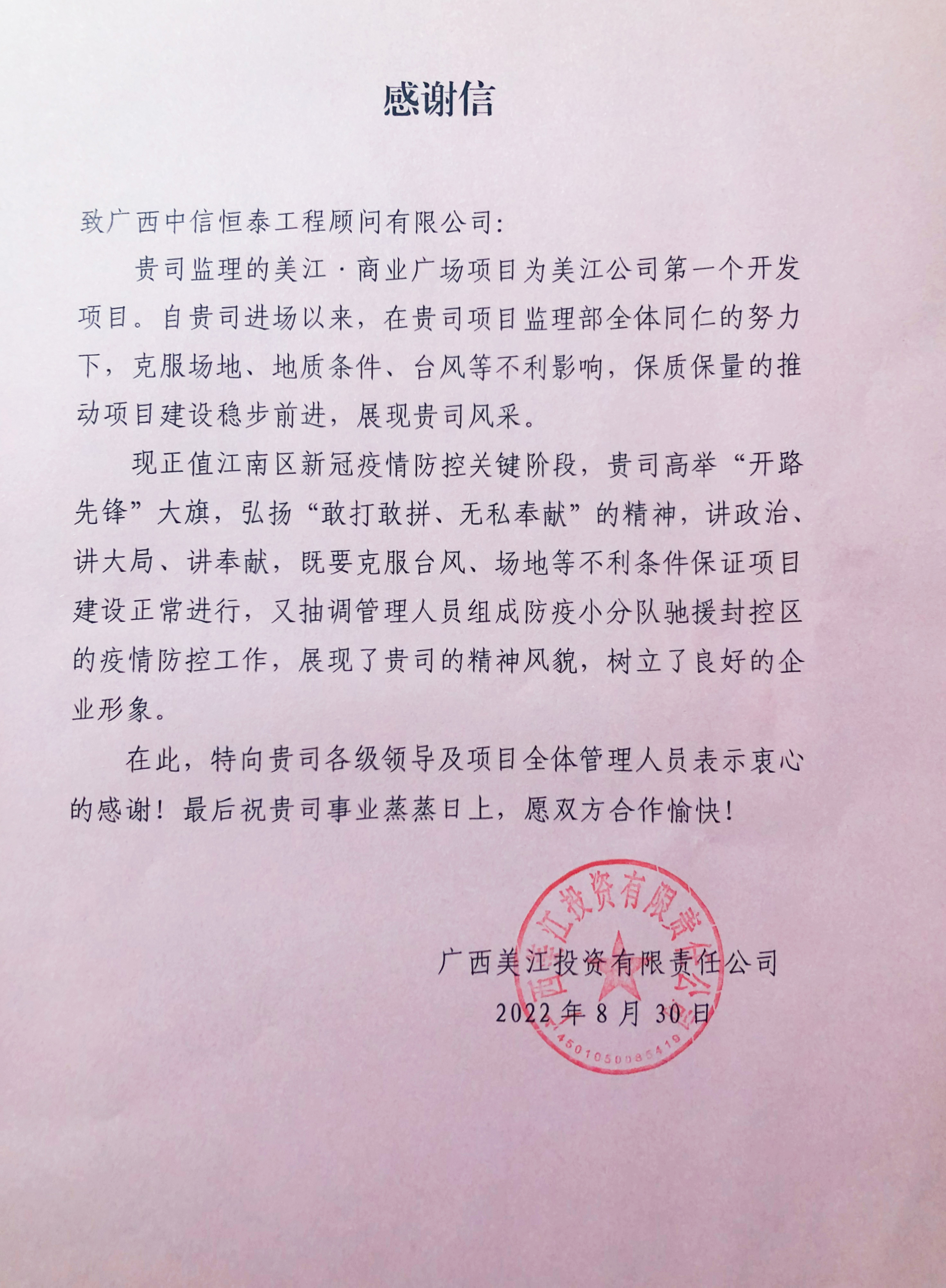 信中提到,在美江·商业广场项目在工程开工建设过程中,面对施工现场场地受限、地质条件、台风等不利因素影响,70net永乐高项目监理部全体员工团结一致、夜以继日、坚守岗位,始终保持严谨细致的工作态度,以专业高效的服务水准为项目提供监理服务,保质保量地推动了项目建设稳步前进。此外,面对突如其来的疫情,70net永乐高项目监理部弘扬“敢打敢拼、无私奉献”的精神,及时抽调人员加入防疫队伍,驰援封控区的疫情防控工作。对此,广西美江投资有限责任公司对70net永乐高的鼎力支持和帮助表示衷心的感谢。